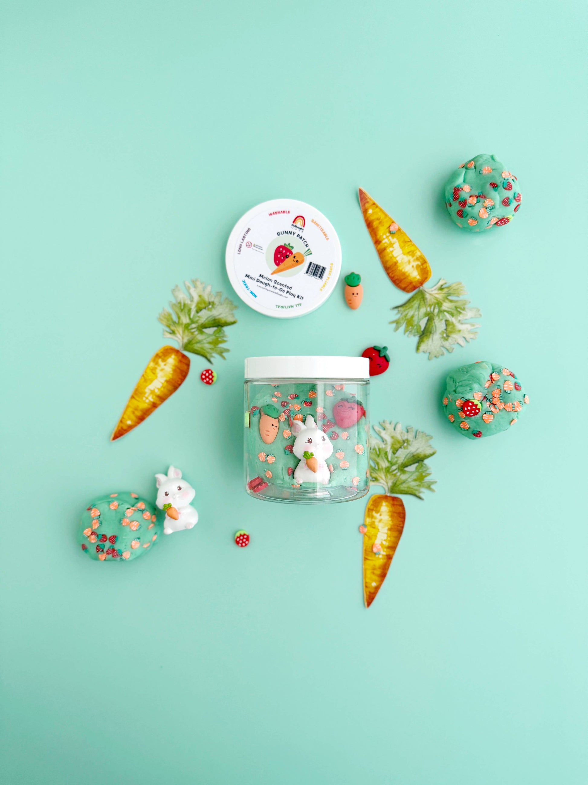Our Bunny Patch Mini "Dough-To-Go" sensory play kit includes an 8 Ounce jar filled with 4 Ounces of Mint Green (Melon) KidDough with Bunny Figurine, carrot and strawberry resin charms, plus carrot and strawberry clay fimos.